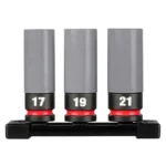 MILWAUKEE SHOCKWAVE Impact Duty 1/2 Drive 6 Point Lug Nut Wheel Sockets feature the Most Durable, Non-Marring Sleeve to protect rims during tire changes. The ARMOR-GUARD Sleeve is made with premium, durable plastic for Lasting Protection against cracking or shredding during wheel installation and removals. The sockets are thin-walled for easy access in tight wheel assemblies and feature a non-marring plastic insert to protect lug nuts during use. The sleeves are color-coded, Gray for Metric sizes and Red for SAE sizes, to ensure easier socket selection while also featuring stamped & ink filled sizes for the Boldest, Longest Lasting markings. Milwaukee sockets are engineered with high strength forged steel for optimized performance in heavy-duty applications. The dual-hole design and ring groove allow for easy socket attachment and removal. MILWAUKEE SHOCKWAVE Impact Duty Lug Nut Wheel Sockets are optimized for use with 1/2″ drive impact wrenches, drivers, ratchets, and adapters and meet ASME industry standards for thin-walled sockets.