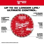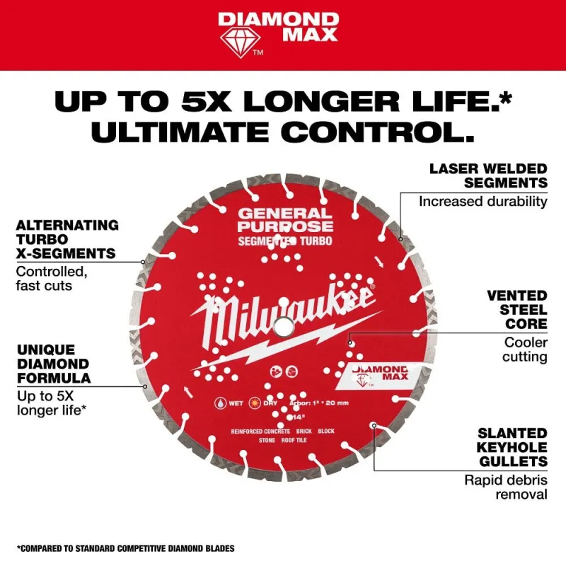 The MILWAUKEE DIAMOND MAX Segmented Turbo General Purpose Diamond Blades deliver up to 5x longer life in concrete and ultimate control. The alternating turbo x-segments deliver more control and faster cuts. Each segment is laser welded to the steel core for increased durability in tough materials; including cured concrete, concrete with rebar, stone, paver, brick, block, and roof tile. These general-purpose diamond blades are designed with slanted keyhole gullets for rapid debris removal. The DIAMOND MAX blades are designed with a vented steel core to keep the blade cooler during cuts.  For use wet and dry.
