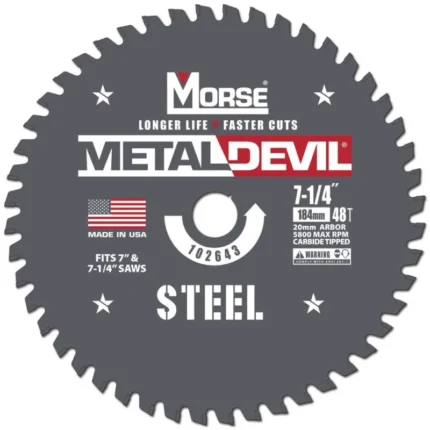 Morse Metal Devil, CSM964FSSC (102742), is specifically designed for cutting stainless steel plate or small solids not exceeding in 1/4″ thickness, and tubing, channel, or other structural shapes not exceeding 1/8″ wall thickness. Blade comes standard as 1″ arbor.