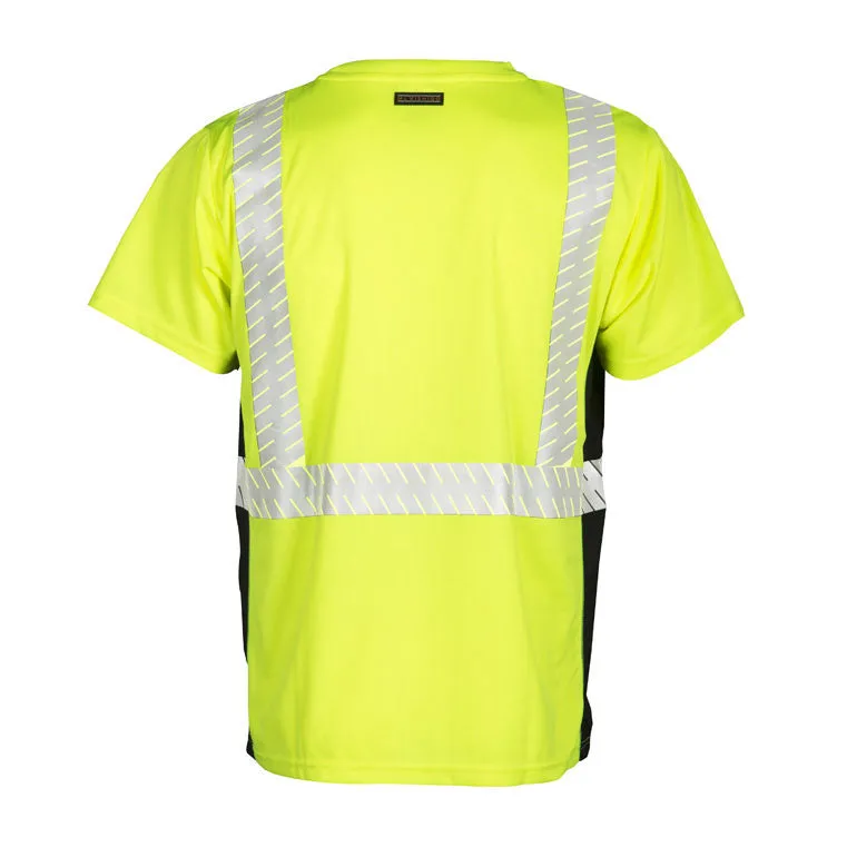 Microfiber polyester material wicks away moisture. 2″ wide high performance breathable reflective tape significantly reduces hot spots and provides greater flexibility over solid tapes. Black sides provide contrast and add a sporty look.