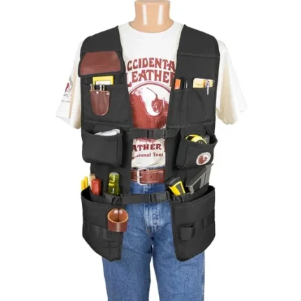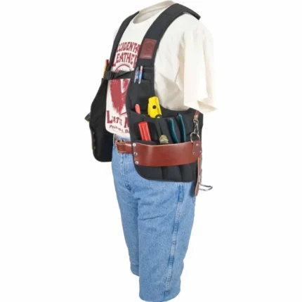 The 2580 is a complete tool system with the 2500LH SuspendaVest packaged with the patented B8064LH (4 pouch fastener bag) and the B8017LH (2 pouch tool bag). Quick disconnect 3″ wide leather belting accepts any tool bag with a tunnel loop up to 8.5″ across. You may remove your bags from the SuspendaVest for finish work or work in tight spaces. Give your body a break, alternate with this belt free system. The SuspendaVest may be used for framing, electrical, concrete or trim applications. Fully adjustable with extra pockets behind the tool holders for hands or gloves. Snaps on and off in seconds with a quick release chest strap buckle. Features a heavy duty “D” ring for hanging storage!