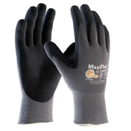 Protective Industrial Products MaxiFlex Ultimate by ATG has a black micro-foam nitrile coated palm & finger tips on a 15 gauge gray seamless knit nylon with Lycra liner.