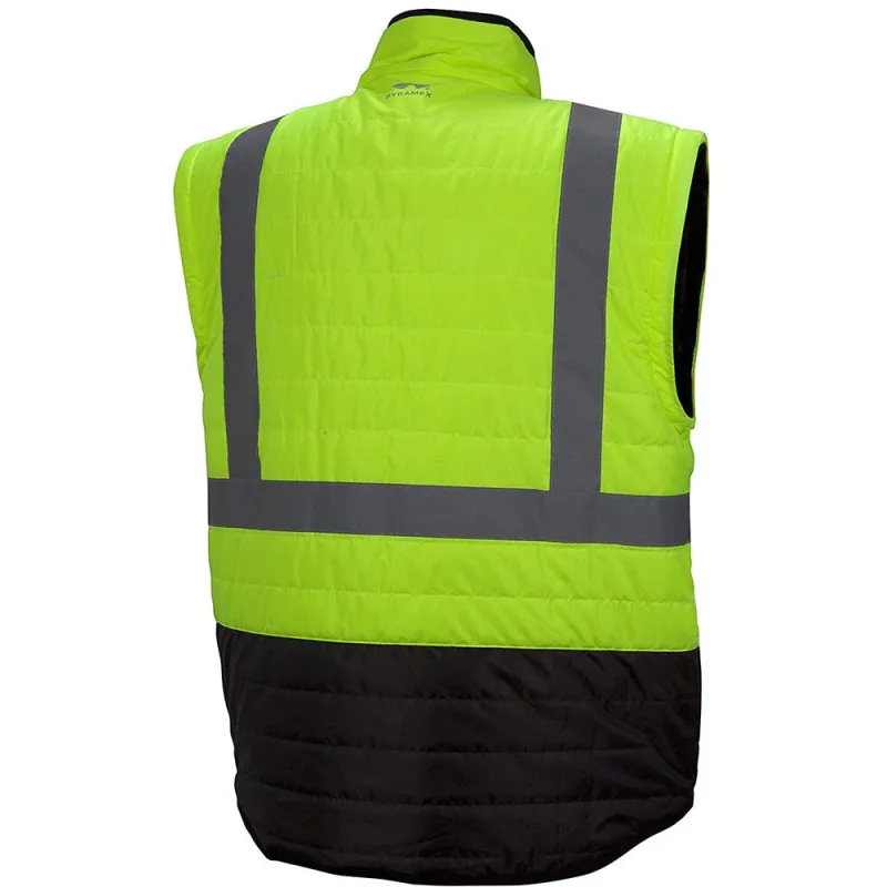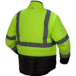 Pyramex Safety – Winter Wear – Hi-Vis Lime Jacket – Size 4X Large. Water repellant 4-in-1 reversible quilted polyfil jacket. Removable, zip-out sleeves – converts Class 3 jacket to Class 2 vest. Reverses from hi-vis lime/black bottom to all black. Silver reflective tape on hi-vis side.