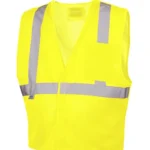 Pyramex Safety RVHL25-Series Type R / Class 2, Hi-Vis Lime Safety Vest. Hi-vis lightweight polyester mesh material with breakaway hook and loop shoulders, sides, and front closure. 2 inch silver reflective material around bottom and over shoulders. Vest has a chest pocket with hook and loop closure and a deep and wide inside pocket. Designed with a D-ring slot for fall protection harness. Class 2/level 2 Hi-Vis lime safety vest.