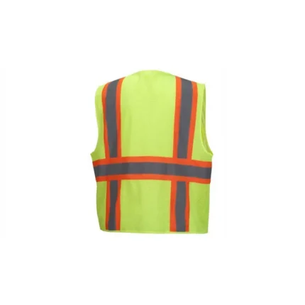 | Reflective striping | One 4” contrasting material stripe applied horizontally with 2” China brand silver reflective stripe centered inside contrasting stripe. Two 4” contrasting material stripes with 2” China brand silver reflective stripe centered inside contrasting stripe run vertically from bottom stripe, over shoulders to the bottom of the vest |