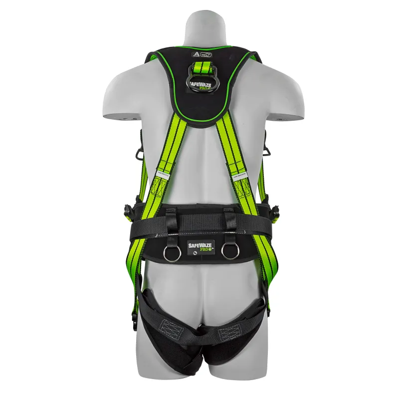 The Safewaze Pro+ Flex Premium Wind Energy Harness utilizes Flex webbing to ensure comfort and movement to enhance worker productivity. Light-weight with all aluminum hardware and superior padding, this harness provides the flexibility and durability for the demanding requirements of wind turbine installation and maintenance, and rescue operations. The unit also incorporates a suspension/rescue front D-ring for added flexibility.