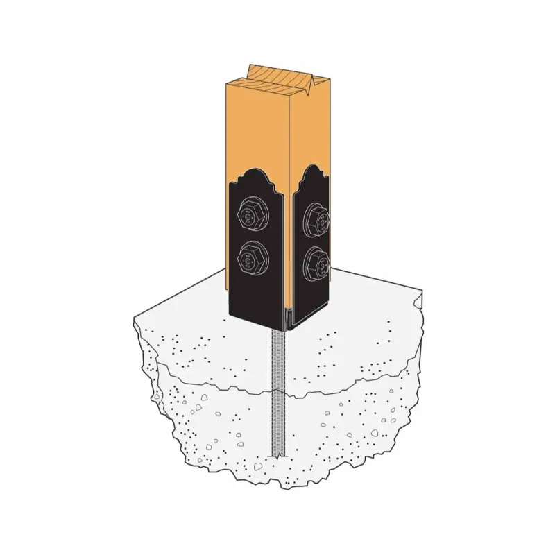 The Simpson APB44DSP ZMAX Black Post Base Side Plate combines strength and style, designed for 4x posts and featuring a durable black powder-coated finish.