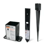 The Simpson Strong-Tie E-Z Spike is a black powder-coated post-base spike designed for easy installation of 4×4 wood posts without the need for digging holes or pouring concrete.