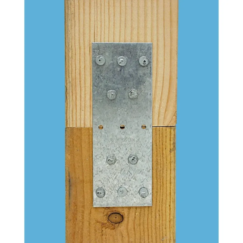 The Simpson TP15 Tie Plate is a versatile solution for connecting wood members, featuring a galvanized finish and a staggered nail pattern for secure connections.