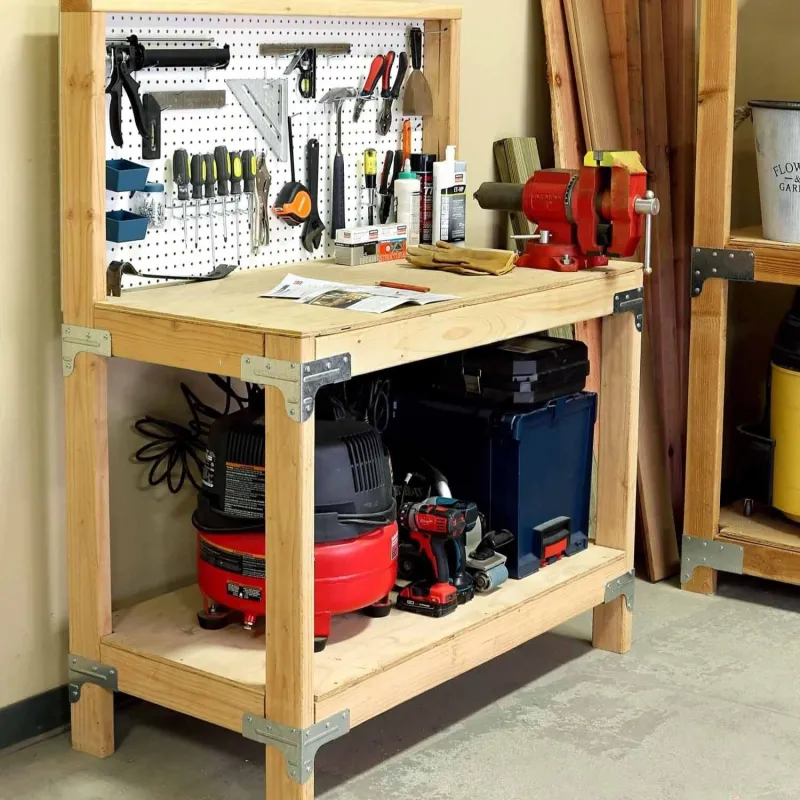 The Simpson Strong-Tie WBSK hardware kit simplifies the construction of workbenches or shelving units, providing all necessary connectors and screws for a single workbench or a four-shelf unit.