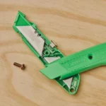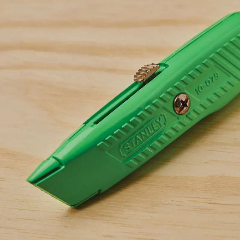 The Stanley high-visibility retractable knife is a bright green that is easy to find in any toolbox or work area. There is a blade storage are in the handle of the knife. A must have for every garage or jobsite.