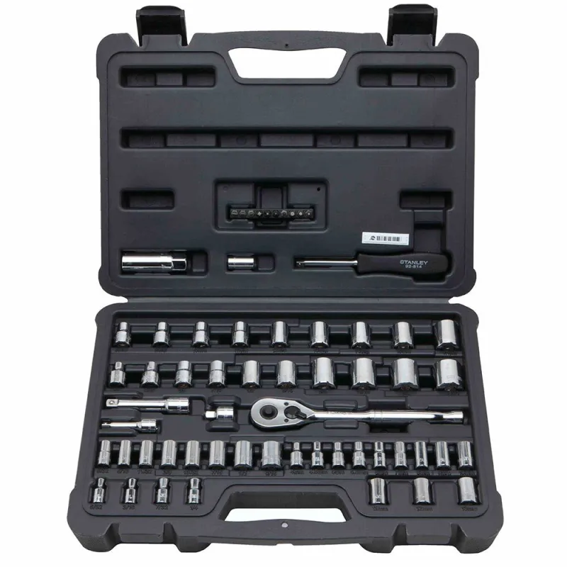 The STANLEY® 60 Piece Mechanics Socket Set is constructed of high-alloy steel and heat-treated for performance. The Max-Drive design provides 15-percent more torque, and meets or exceeds ANSI standards for sockets and ratchets.This set includes a 72 tooth ratchet for smooth operation in tight spaces.
