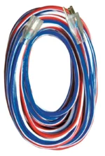 The Voltec Power & Lighting Red/White/Blue extension cords are made of high quality materials and have a Super-Flex jacket that can withstand some of the most rugged work environments. Show your American pride during holiday events or on jobsites, constructions sites, or even just for work around the house or yard. These cords are proudly made in the U.S.A. and provide quality you can trust. This 3 conductor 300V cord is perfect for indoor and outdoor use and will continue to supply power in temperatures of -49 F Deg. – 167 F Deg. This cord is a 100ft 12/3 SJTW Red/White/Blue extention cord with a clear 5-15 plug and a clear lighted 5-15R receptacle. Rated for 15 Amps and 1875 Watts and is also cULus Listed for quality and safety.