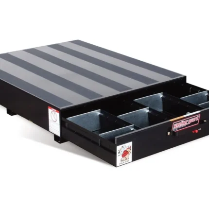Heavy-duty pull out truck bed storage keeps bed space open and supplies organized. The Model 308-3 steel Pack Rat Standard Drawer Unit for truck bed storage and cargo van storage has 4 compartments with 24 dividers. The slide out truck bed tool box and cargo van tool box has a roll-out drawer load rating of 425lbs evenly distributed. The steel top and sides have a load rating of 750lbs evenly distributed. This truck bed storage and cargo van storage unit can be mounted inside the rear of the vehicle to provide easy access to large tools and supplies while leaving floor space open.