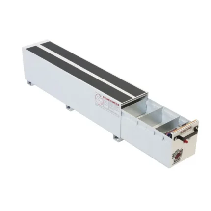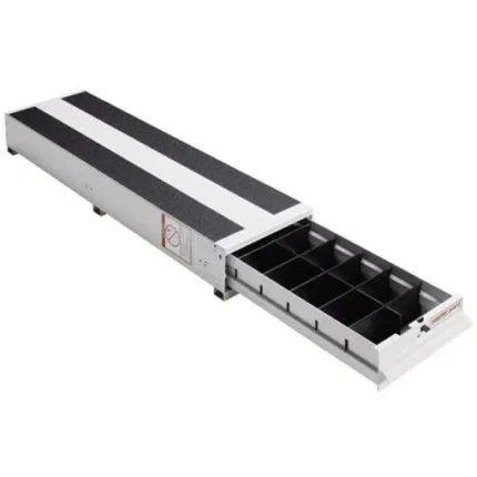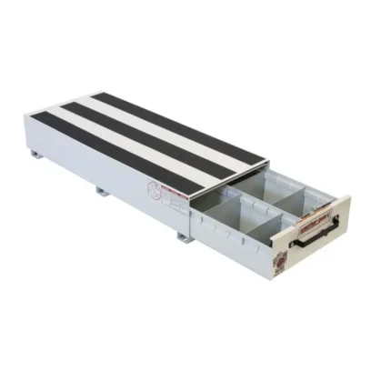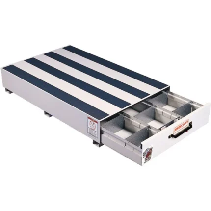 - Anti-skid strips provide traction for work boots on top of slide out truck bed tool box and cargo van tool box