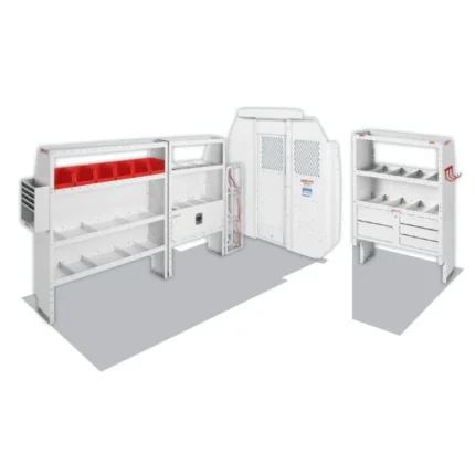 • Includes 60″ high adjustable cargo van shelving and a mesh van bulkhead with swinging door kit