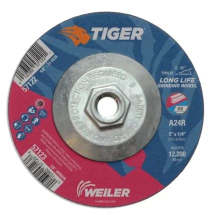 Weiler 57122 5" x 1/4" Tiger Type 27 Grinding Wheel, A24R, 5/8"-11 UNC Nut $83.99 Original price was: $83.99.$27.71Current price is: $27.71.