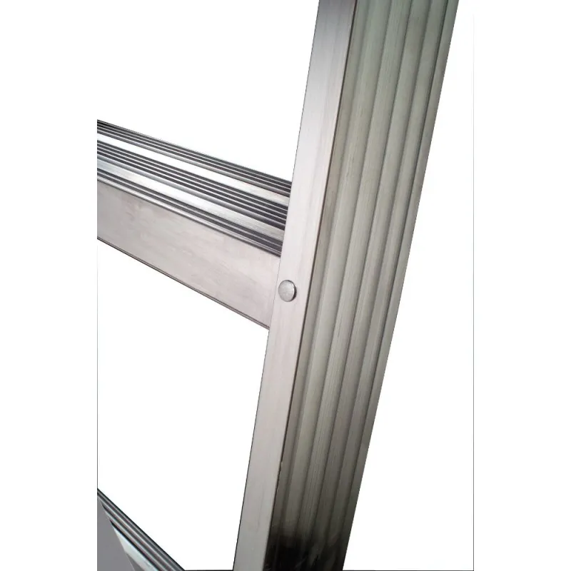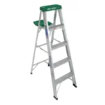 The 355 Aluminum 5ft Stepladder has a Duty Rating of 225lb and TOOL-TRA-TOP® that feature a convenient tray for holding tools or a paint can and slots for a paint roller tray. There is also a sturdy molded paint can hanger on the back of the top. The automatic SPILL-PROOF® pail shelf opens and closes with the ladder. The TRACTION-TRED® steps are slip resistant.