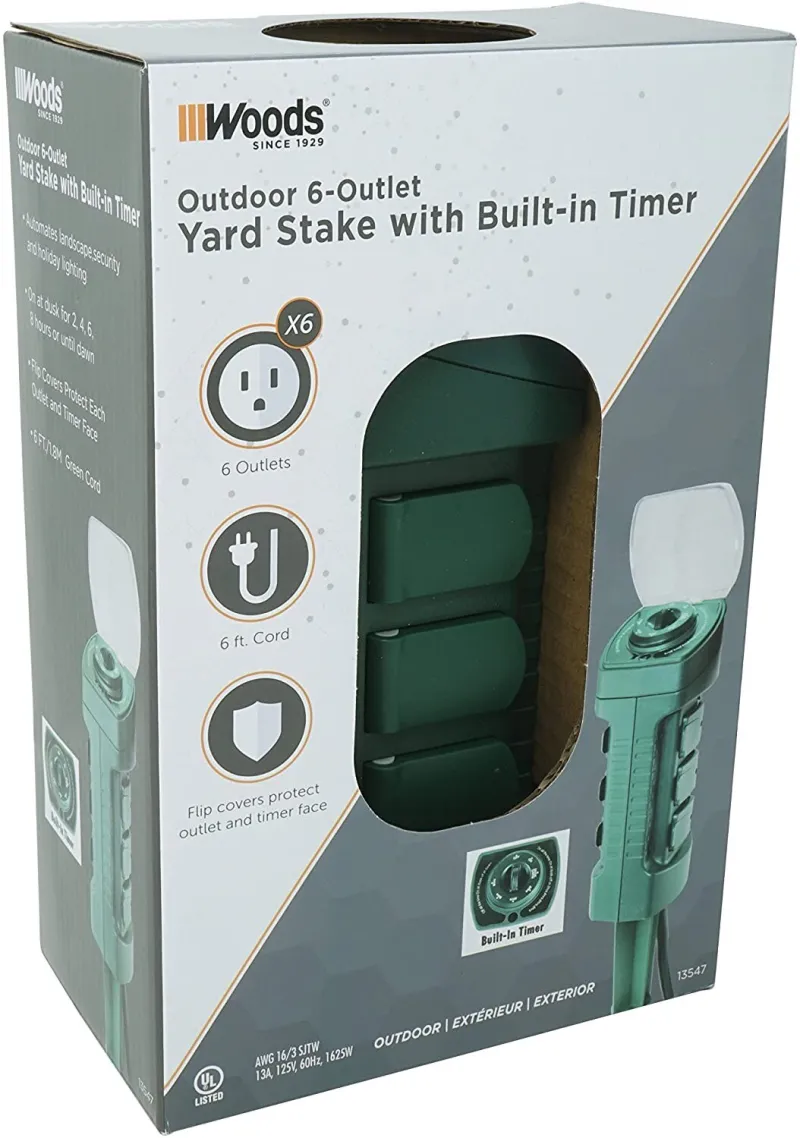 Yard Master 13547 6-Outlet Power Stake with Light Sensor and 6-Foot Cord. Contains 6-feet of 16/3-gauge cord, green color blends in with your landscaping. Accepts up to 6 plugged-in items at a time, weatherproof timer and outlet covers make this perfect for use any season. 15A rating at 125V, 16/3-gauge, SJTW(rated weatherproof). Featuring built-in rain-proof mechanical timer, auotmate and set lighting schedules. Several timer cycles include ON at dusk, OFF at dawn, OFF always, 2, 4, 6, and 8-hour cycles . May save you on energy costs, light sensor unit will automatically turn On/Off lights as needed. Ratings: 125V/15A/1875W Resistive; 125V/8A/1000W Tungsten. TOLL FREE HOTLINE, 1-800-561-4321. If you have immediate questions about application, installation, troubleshooting, or a damaged component, please call CCI Consumer product hotline at 1-800-561-4321 or email questions to: [email protected]. Yard Master (TM ) is a registered trademark of Coleman Cable Inc.
