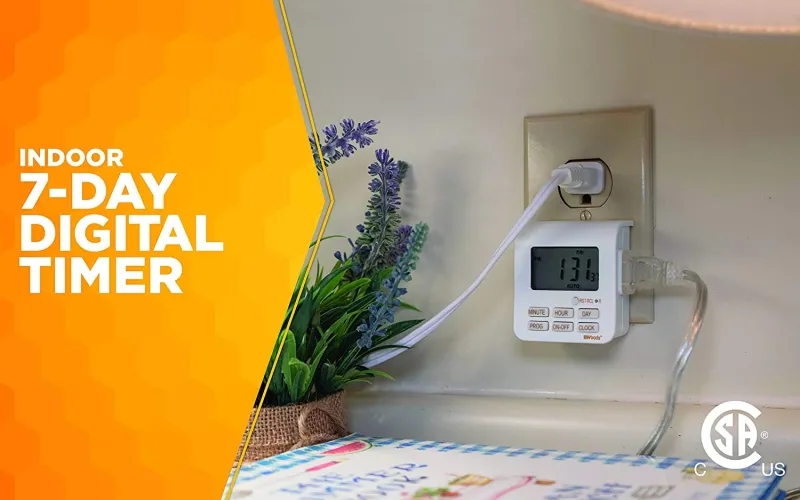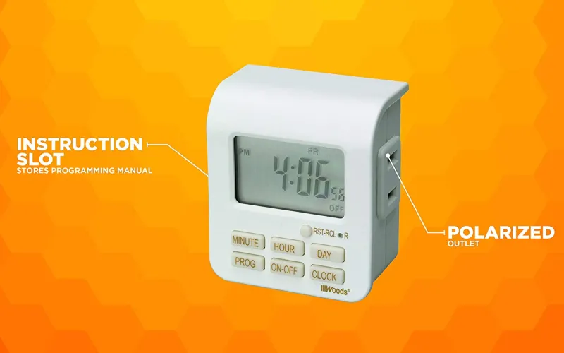 The Indoor Digital 7-Day Timer gives your home a lived in look so it’s less attractive to burglars by timing lights to turn on at set times. Or plug a holiday light into the timer so you can enjoy your decorations as the turn on and off automatically. Have a lamp in a hard-to-reach location? Put it on the timer and set to turn on and off at specific times. The Indoor Digital Timer is programmable with up to 20 On/Off events that repeat weekly with the option to program each day different or weekends different than weekdays. Turn lights on and off during weekdays so your home looks occupied while you are still at the office or program hallway lamps, kitchen radios or mud room fans to turn on and off at set times. The white and taupe finish compliments today’s home interior. The instruction slot holds the programming manual, so if you can quickly locate the instructions if you want to reprogram the timer. Features include to-the-minute accuracy, easy-to-read large LCD display and manual override button to turn the timer off and outlet on. During power outages this timer retains its settings with a self-charging battery backup. This timer is compatible with compact fluorescent lighting (CFL), LED bulbs and CSA certified for quality assurance. The Woods brand of timers and home controls bring simplicity to your life, by maximizing convenience, security and energy savings. TOLL FREE HOTLINE, 1-800-561-4321. If you have immediate questions about application, installation, troubleshooting, or a damaged component, please call CCI Consumer product hotline at 1-800-561-4321