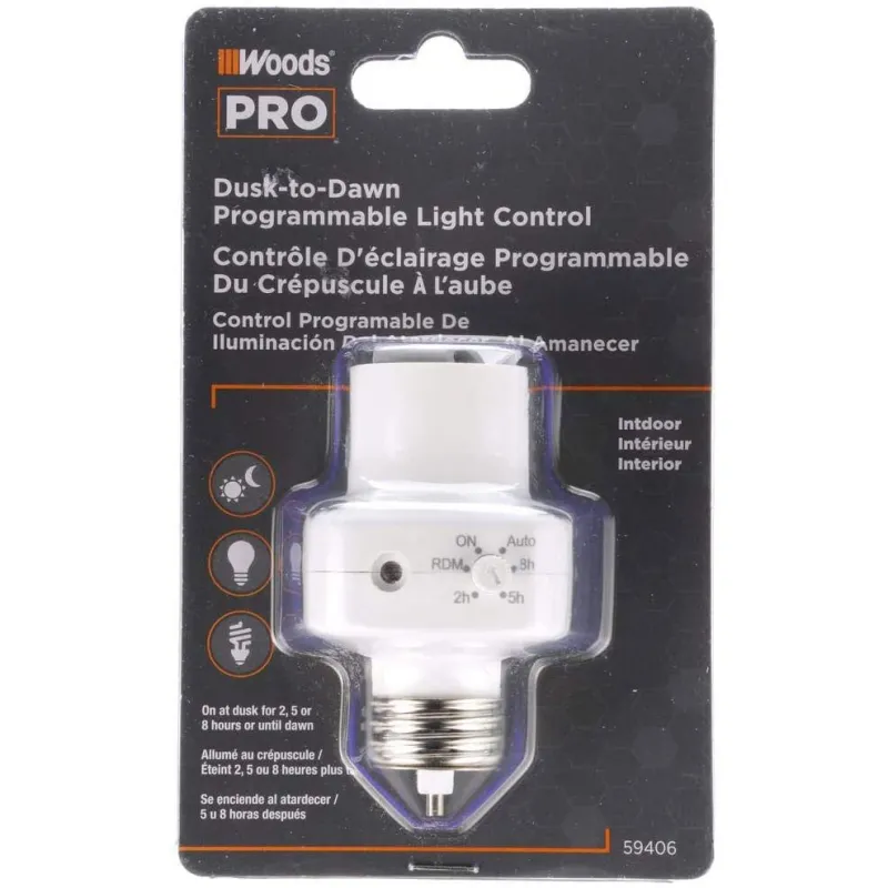 The programmable light control socket with a timed photocell turns on at dusk and off at 2, 5, 8 hours or dawn. Perfect for controlling table lamps or overhead light, giving your home a lived in look while your away. Easy installation with simple tool free set-up and no wiring required.