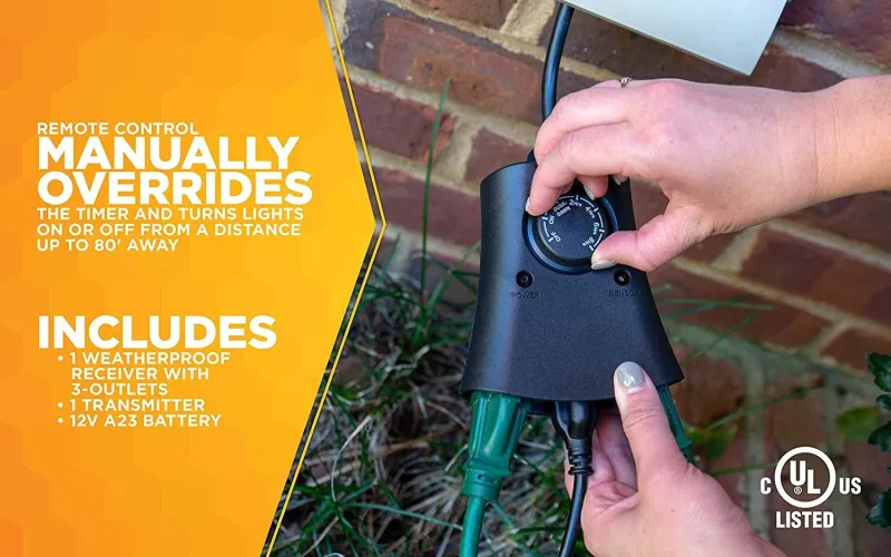 Woods 59746 Outdoor 24-Hr Photoelectric Timer with Remote Control, 3-Outlet. Control outdoor lights with a push of a button from inside our home. Control outdoor lights and animated holiday decorations with a push of a button from inside your home. Automatically on at dusk and off at dawn or programmable on at dusk and off 2, 4, 6, or 8 hours later. Remote control manually overrides the timer, turns lights on or off from a distance up to 80 feet away – with 3 grounded outlets. Compatible with CFL, LED & incandescent lighting, cUL Listed. Rated 125V, 60Hz 10 A General Purpose/10 A Resistive/1000 W Tungsten/500 VA Electronic Ballast 120Vac 60Hz 8.3A Ballast 1/2 HP. The Woods (R) brand is a registered trademark of Coleman Cable Inc. TOLL FREE HOTLINE, 1-800-561-4321. If you have immediate questions about application, installation, troubleshooting, or a damaged component, please call CCI Consumer product hotline at 1-800-561-4321 or email questions to: [email protected]